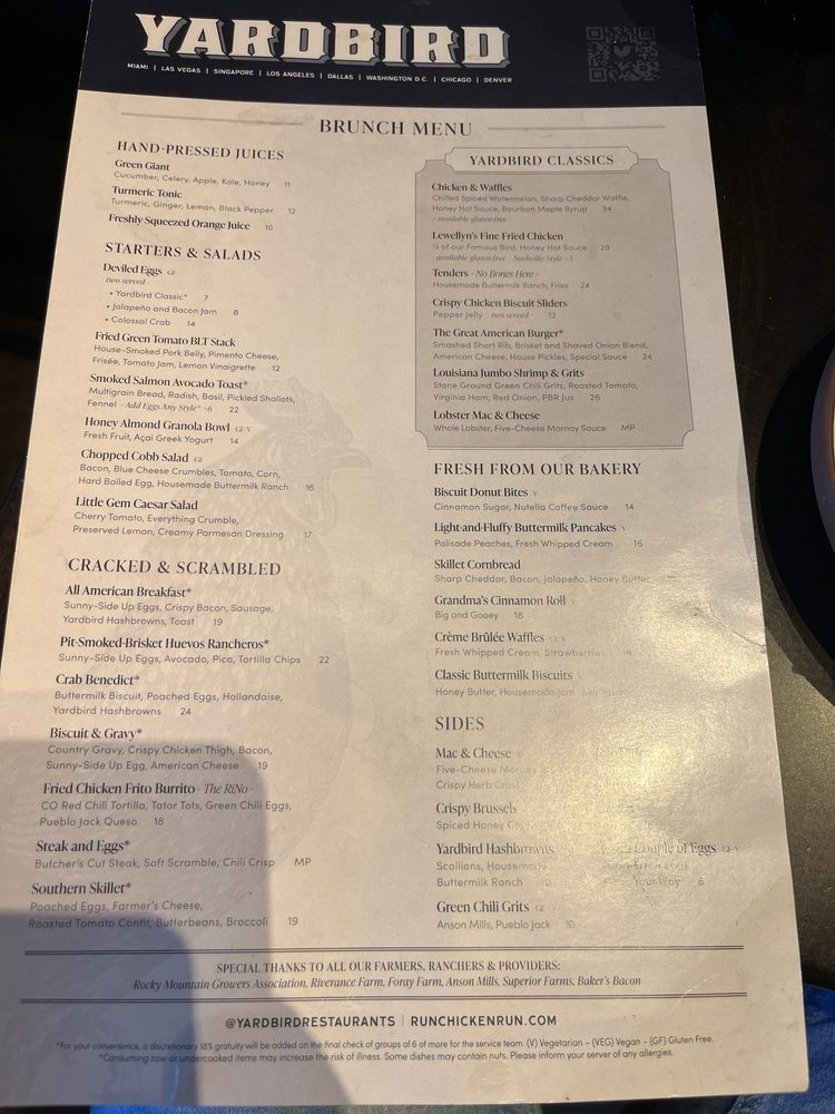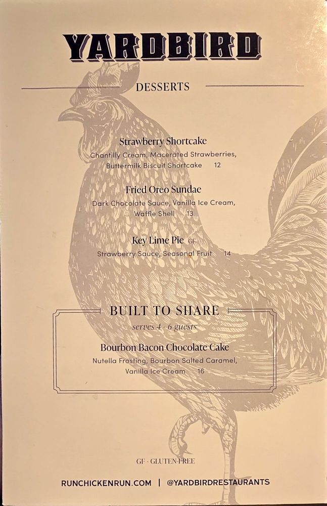 Yardbird Fried Chicken, Mac & Cheese, House Pickles, St. Louis Ribs, Buttermilk Biscuits, Spiced Cracklings, 1 lb Smoked Brisket Over Bacon Baked Beans